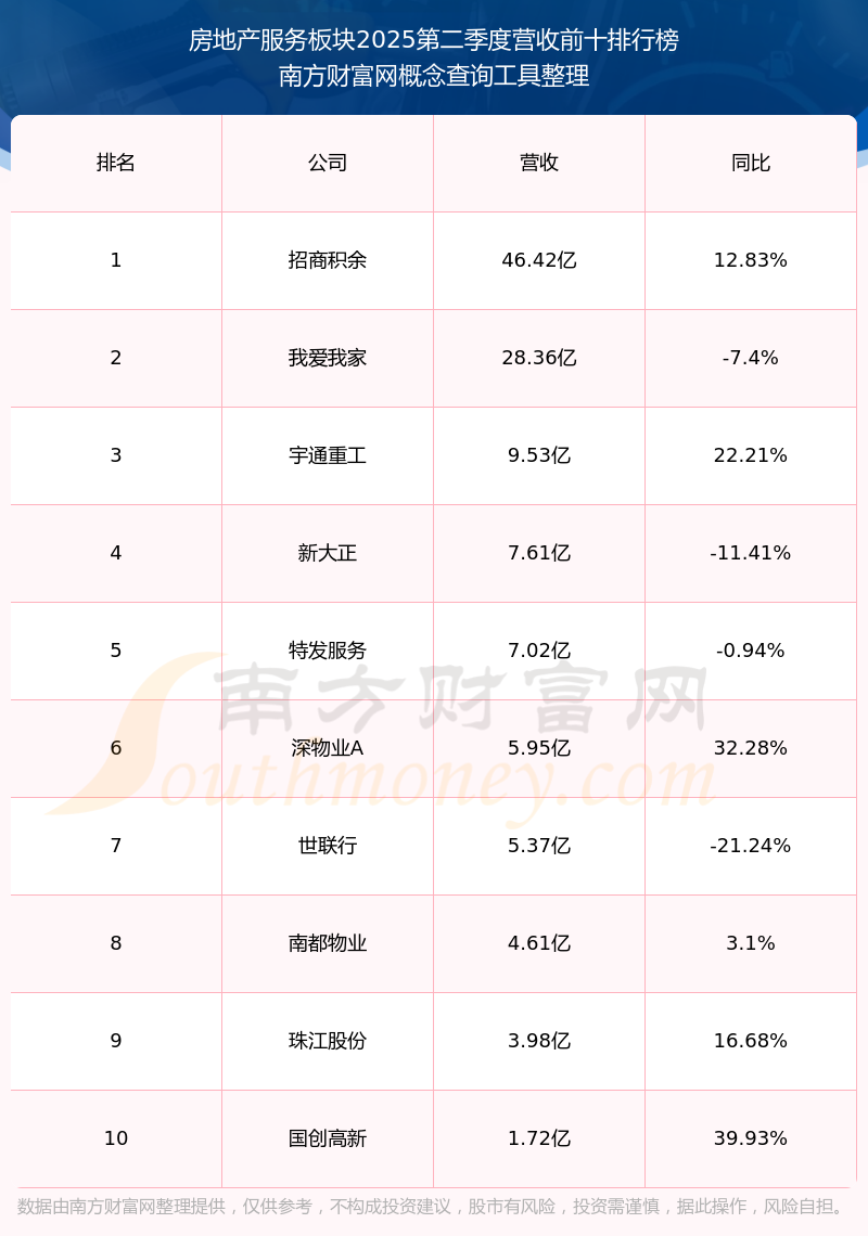 按照南方财富网概念查询工具统计,该股所属板块为房地产服务板块,该板块共有11只股票,北辰实业2025第二季度营收在该板块中排名为第11名,该板块2025第二季度营收排名前十的股票如下表: