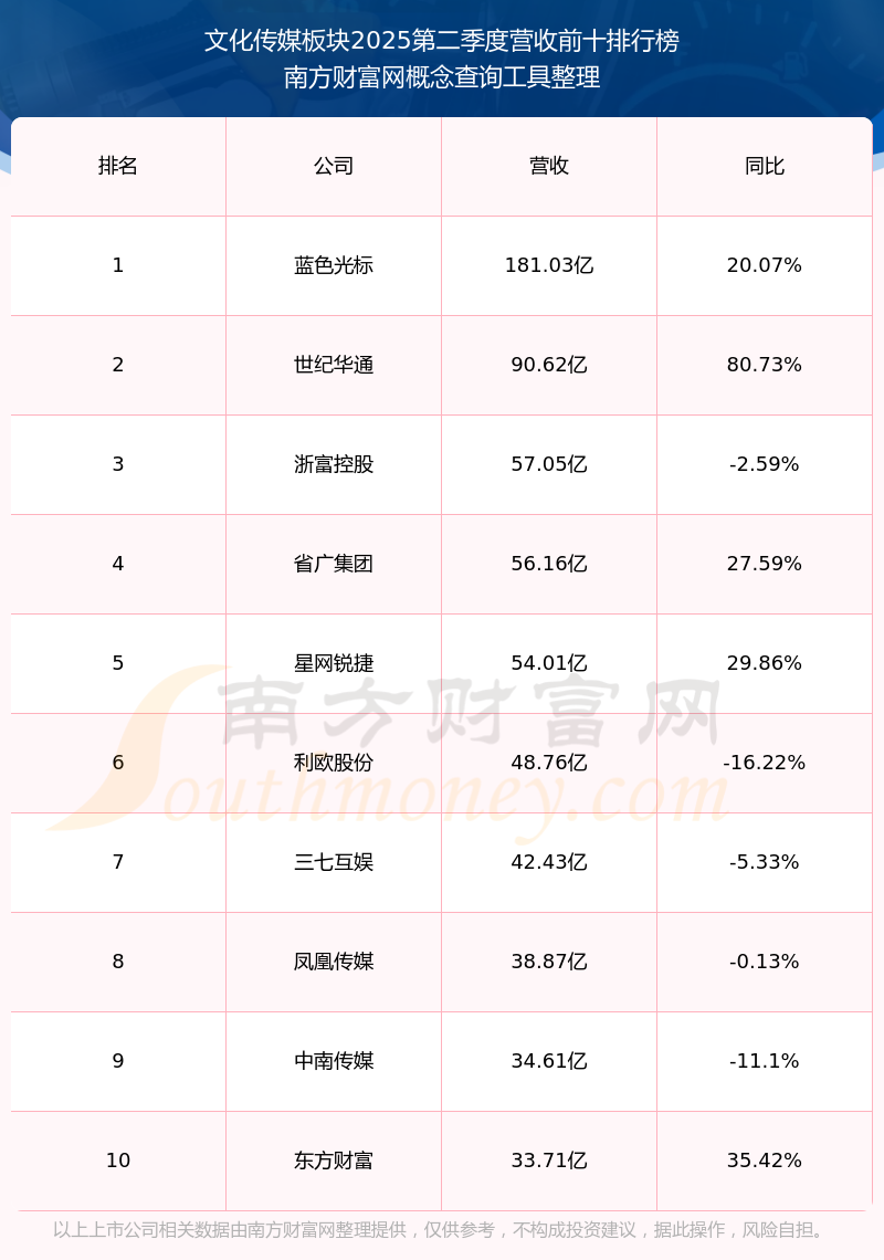 按照南方财富网概念查询工具统计,该股所属板块为文化传媒板块,该板块共有240只股票,中国科传2025第二季度营收在该板块中排名为第65名,该板块2025第二季度营收排名前十的股票如下表: