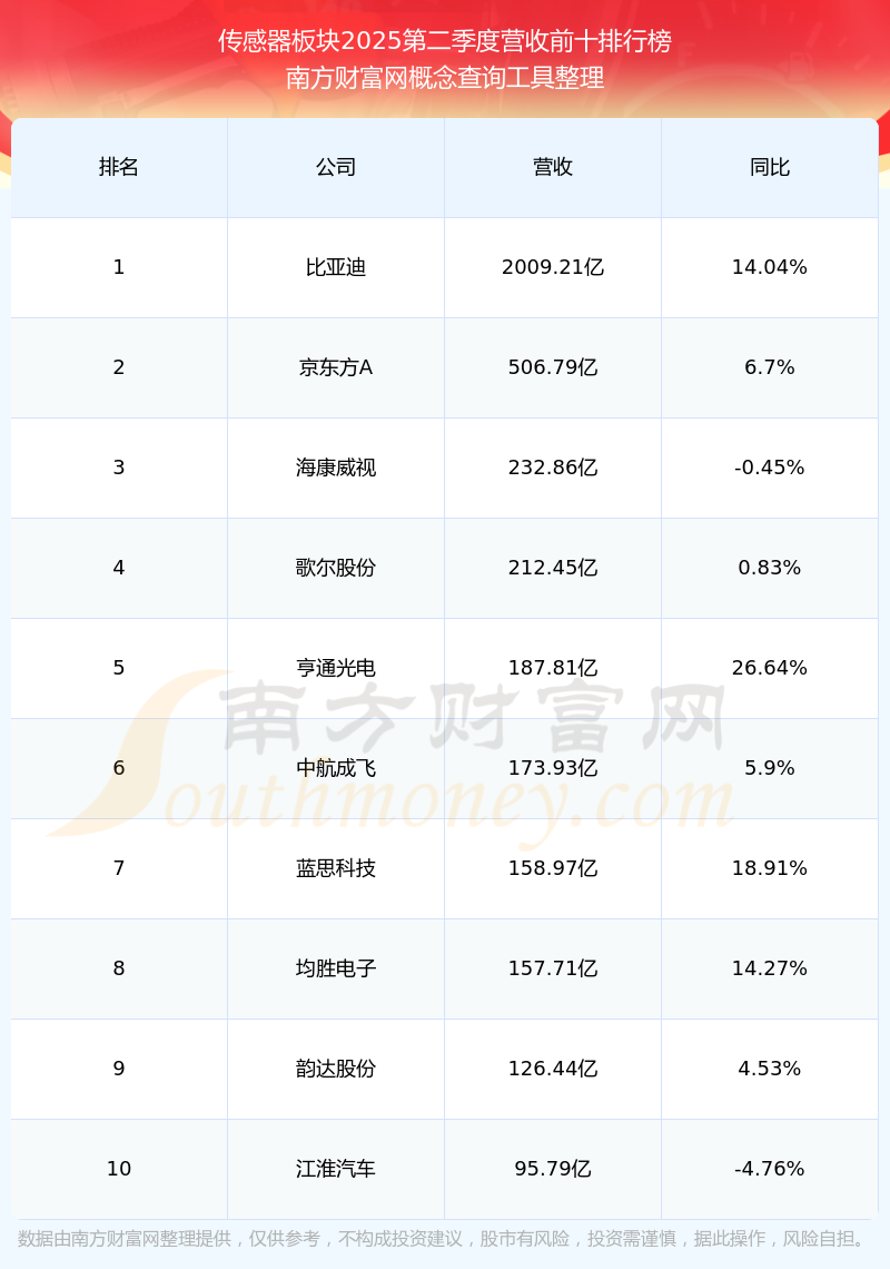 按照南方财富网概念查询工具统计,该股所属板块为传感器板块,该板块共有190只股票,共进股份2025第二季度营收在该板块中排名为第33名,该板块2025第二季度营收排名前十的股票如下表: