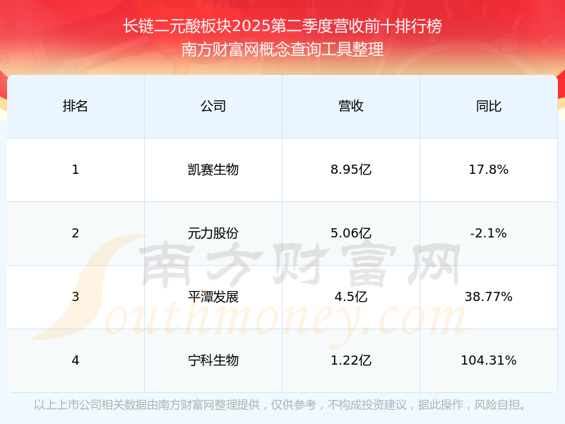 按照南方财富网概念查询工具统计,该股所属板块为长链二元酸板块,该板块共有4只股票,宁科生物2025第二季度营收在该板块中排名为第4名,该板块2025第二季度营收排名前十的股票如下表:
