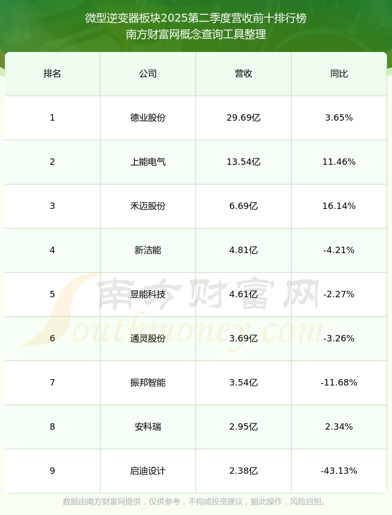 按照南方财富网概念查询工具统计,该股所属板块为微型逆变器板块,该板块共有9只股票,禾迈股份2025第二季度营收在该板块中排名为第3名,该板块2025第二季度营收排名前十的股票如下表: