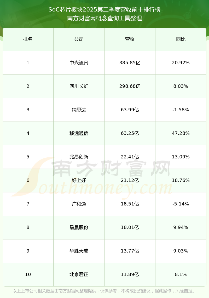 按照南方财富网概念查询工具统计,该股所属板块为SoC芯片板块,该板块共有52只股票,晶华微2025第二季度营收在该板块中排名为第52名,该板块2025第二季度营收排名前十的股票如下表: