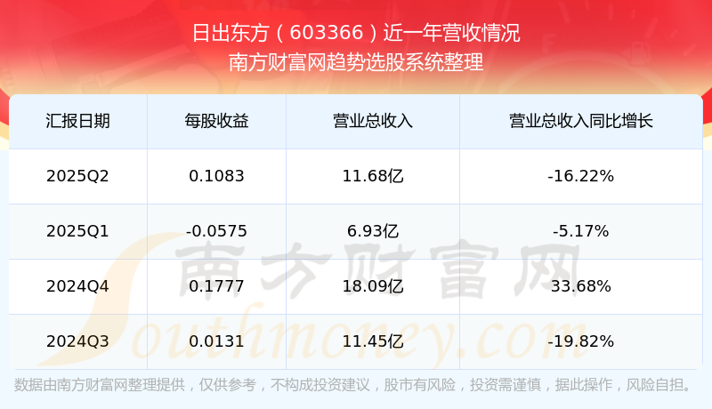 2025年第二季度,日出东方营收同比-16.22%,净利润同比-19.22%。