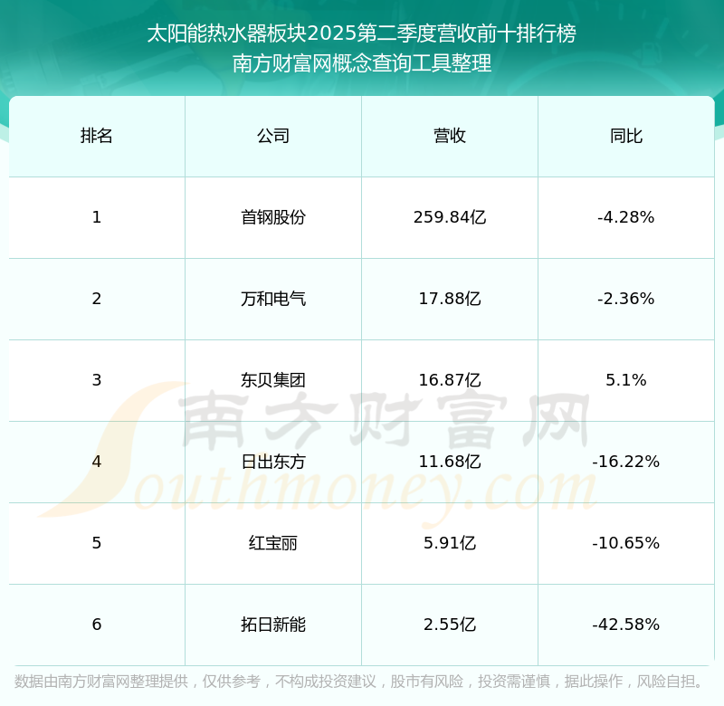 按照南方财富网概念查询工具统计,该股所属板块为太阳能热水器板块,该板块共有6只股票,日出东方2025第二季度营收在该板块中排名为第4名,该板块2025第二季度营收排名前十的股票如下表: