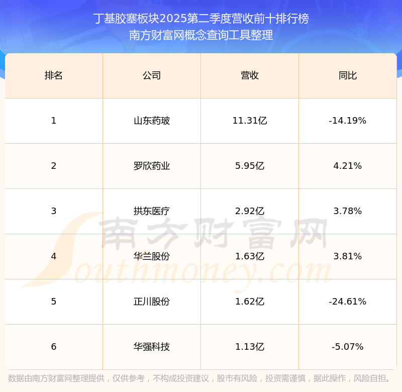 按照南方财富网概念查询工具统计,该股所属板块为丁基胶塞板块,该板块共有6只股票,华强科技2025第二季度营收在该板块中排名为第6名,该板块2025第二季度营收排名前十的股票如下表: