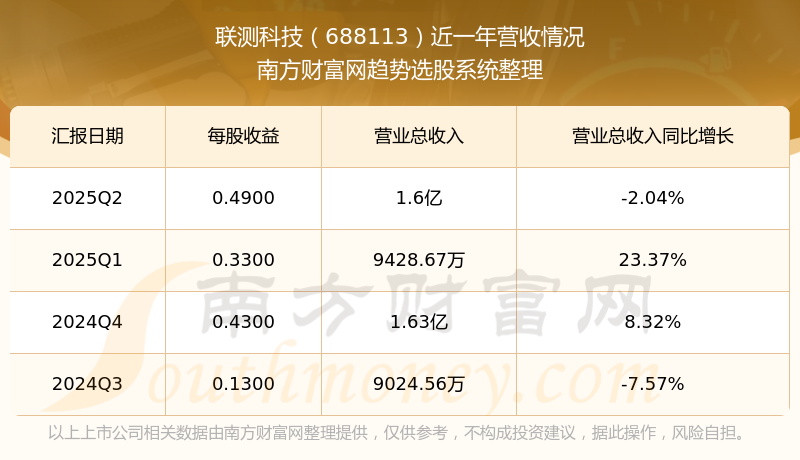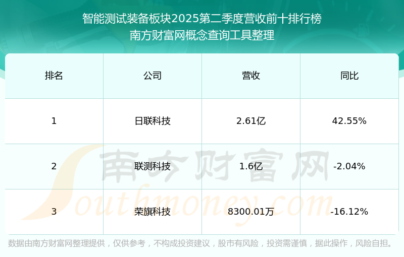 按照南方财富网概念查询工具统计,该股所属板块为智能测试装备板块,该板块共有3只股票,联测科技2025第二季度营收在该板块中排名为第2名,该板块2025第二季度营收排名前十的股票如下表:
