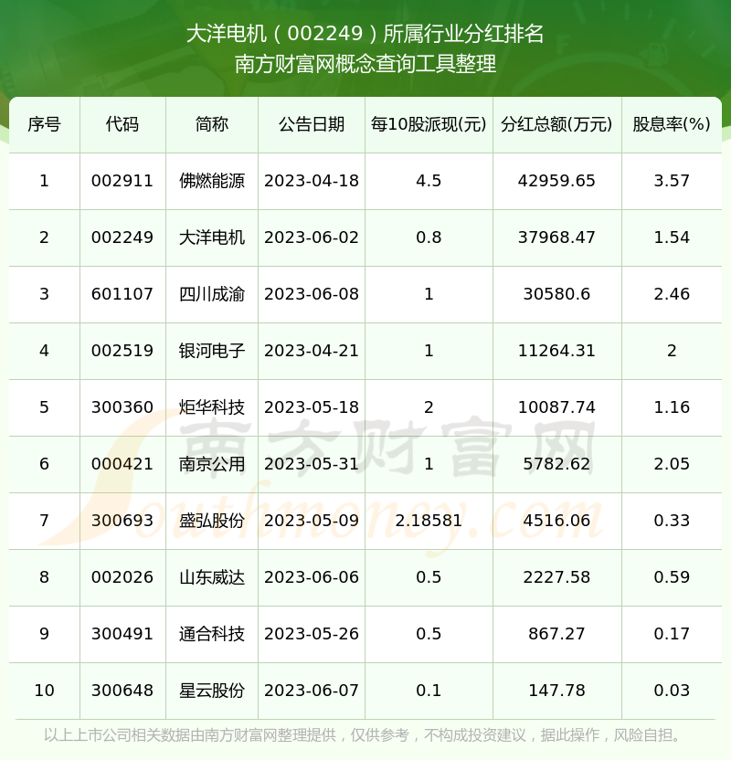按照南方财富网趋势选股系统统计,大洋电机所属行业为电机行业,电机行业分红排名情况如下表: