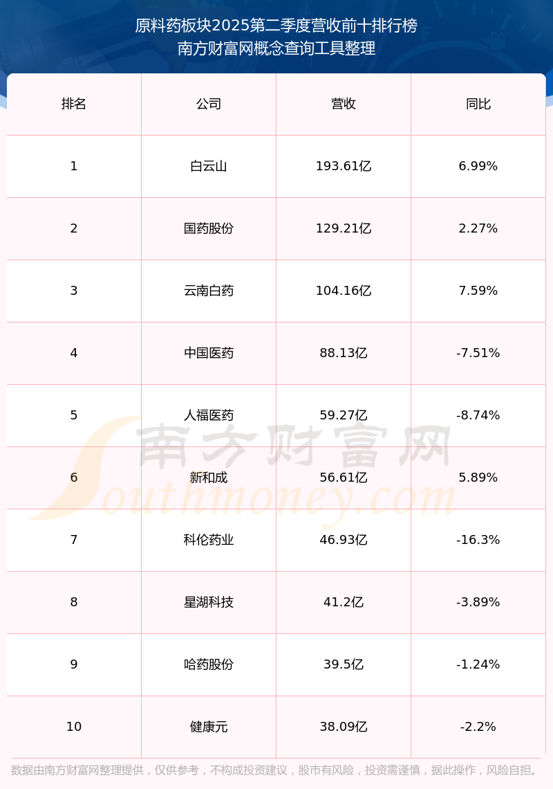 按照南方财富网概念查询工具统计,该股所属板块为原料药板块,该板块共有121只股票,苑东生物2025第二季度营收在该板块中排名为第74名,该板块2025第二季度营收排名前十的股票如下表: