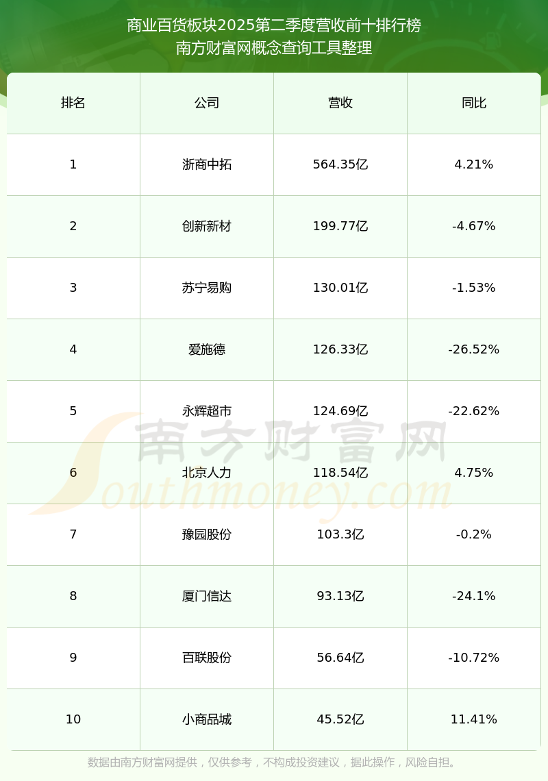 按照南方财富网概念查询工具统计,该股所属板块为商业百货板块,该板块共有75只股票,欧亚集团2025第二季度营收在该板块中排名为第20名,该板块2025第二季度营收排名前十的股票如下表: