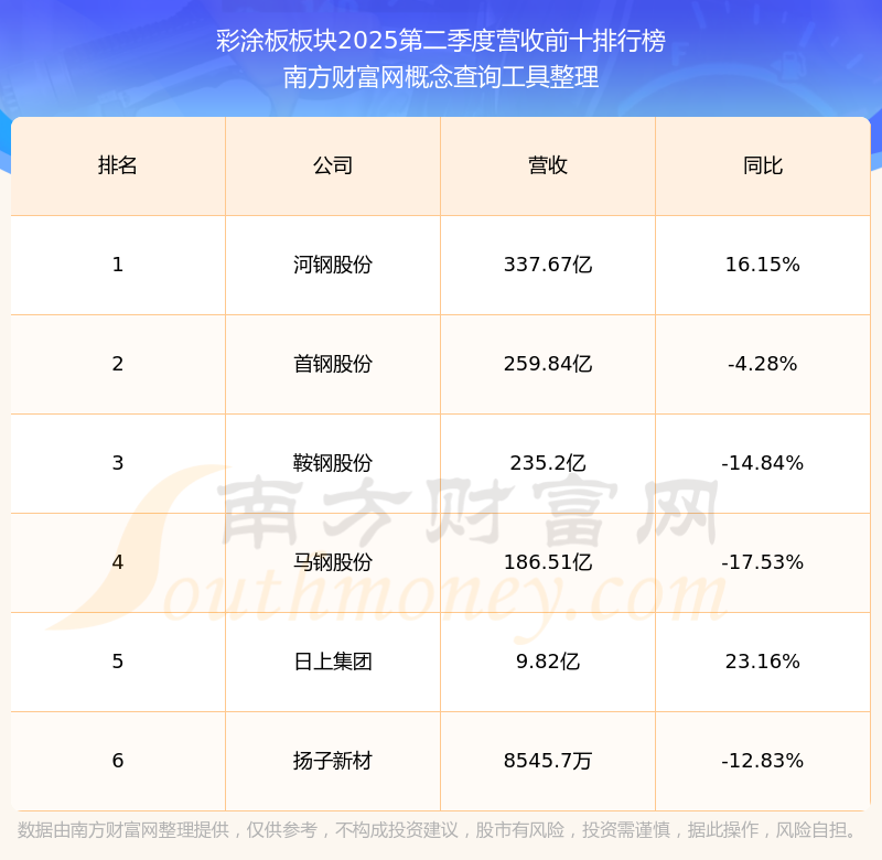 按照南方财富网概念查询工具统计,该股所属板块为彩涂板板块,该板块共有6只股票,华达新材2025第二季度营收在该板块中排名为第6名,该板块2025第二季度营收排名前十的股票如下表: