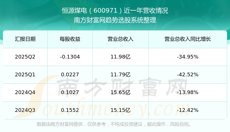 恒源煤电(600971)发布2025年第二季度财报。2025年第二季度恒源煤电实现营业收入11.98亿元,同比增加-34.95元%,环比增加1.65%;净利润为-1.56亿元,同比增长-147.79%,环比增长-675.36%。