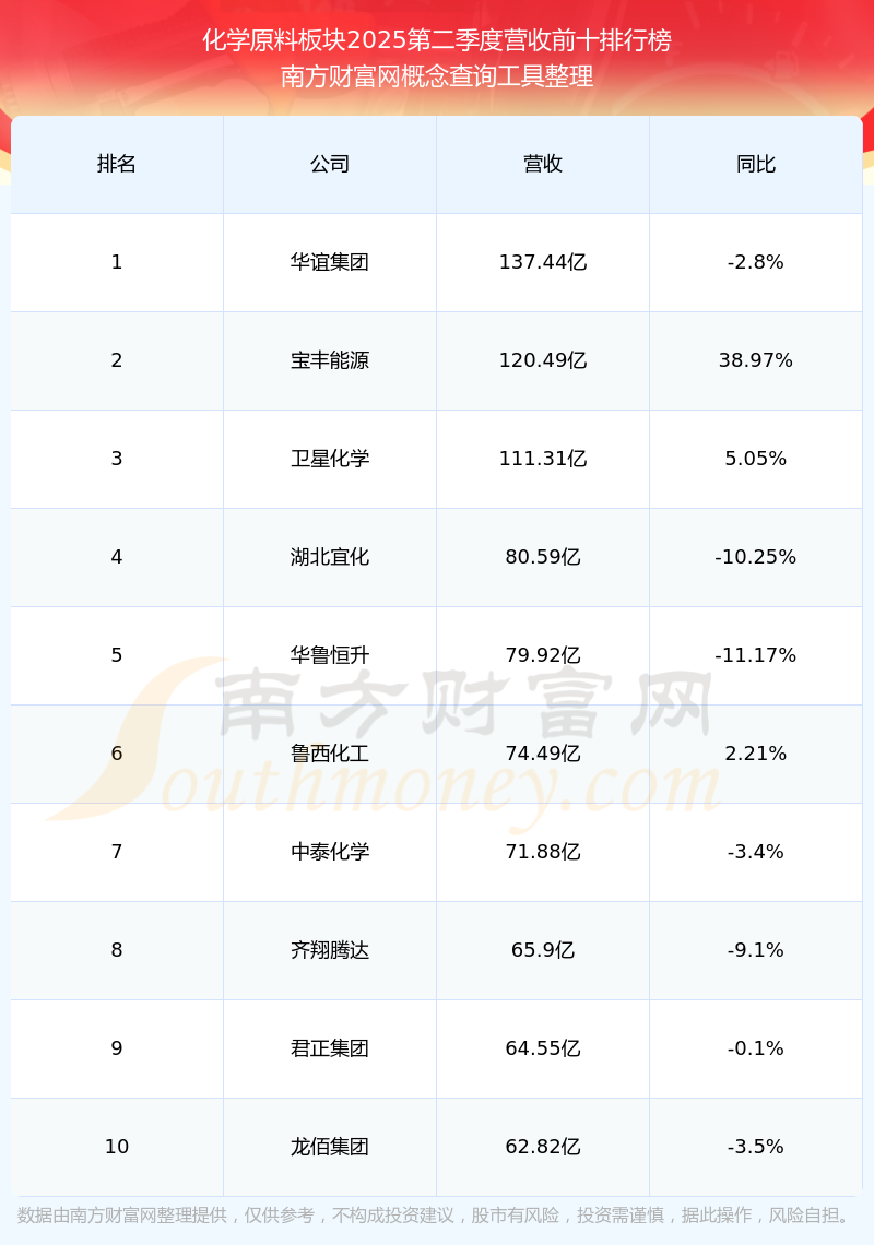 按照南方财富网概念查询工具统计,该股所属板块为化学原料板块,该板块共有105只股票,雪天盐业2025第二季度营收在该板块中排名为第37名,该板块2025第二季度营收排名前十的股票如下表: