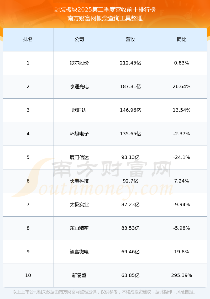 按照南方财富网概念查询工具统计,该股所属板块为封装板块,该板块共有53只股票,甬矽电子2025第二季度营收在该板块中排名为第53名,该板块2025第二季度营收排名前十的股票如下表: