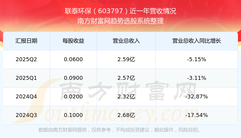 在2025年第二季度,联泰环保的业绩表现,主营业务收入达到2.59亿元,实现了-5.15%的同比增长率。同时,公司归母净利润录得3057.19万元,同比增长-42.87%。