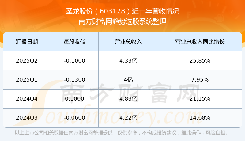 圣龙股份2025年第二季度财报显示,公司主营收入4.33亿元,同比25.85%;归母净利润-2420.38万元,同比-221.26%;扣非净利润-2782.61万元,同比16.94%;