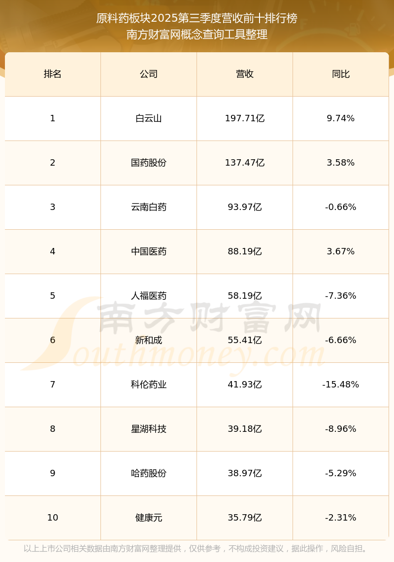 按照南方财富网概念查询工具统计,该股所属板块为原料药板块,该板块共有120只股票,诺泰生物2025第三季度营收在该板块中排名为第60名,该板块2025第三季度营收排名前十的股票如下表: