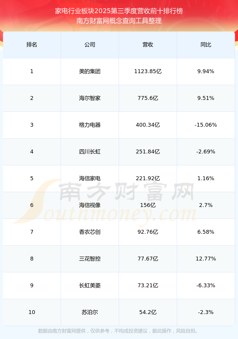 按照南方财富网概念查询工具统计,该股所属板块为家电行业板块,该板块共有64只股票,欧普照明2025第三季度营收在该板块中排名为第64名,该板块2025第三季度营收排名前十的股票如下表: