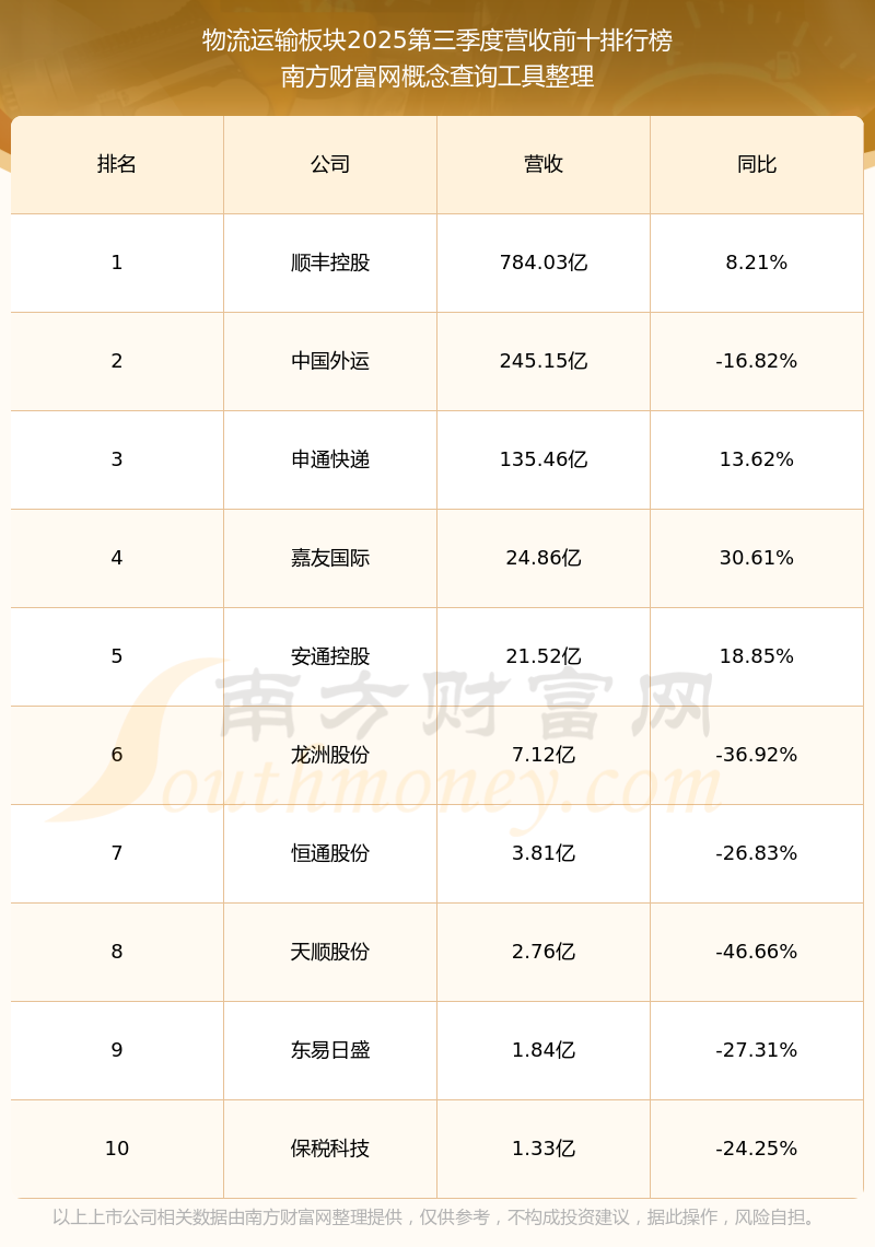 按照南方财富网概念查询工具统计,该股所属板块为物流运输板块,该板块共有11只股票,中谷物流2025第三季度营收在该板块中排名为第11名,该板块2025第三季度营收排名前十的股票如下表: