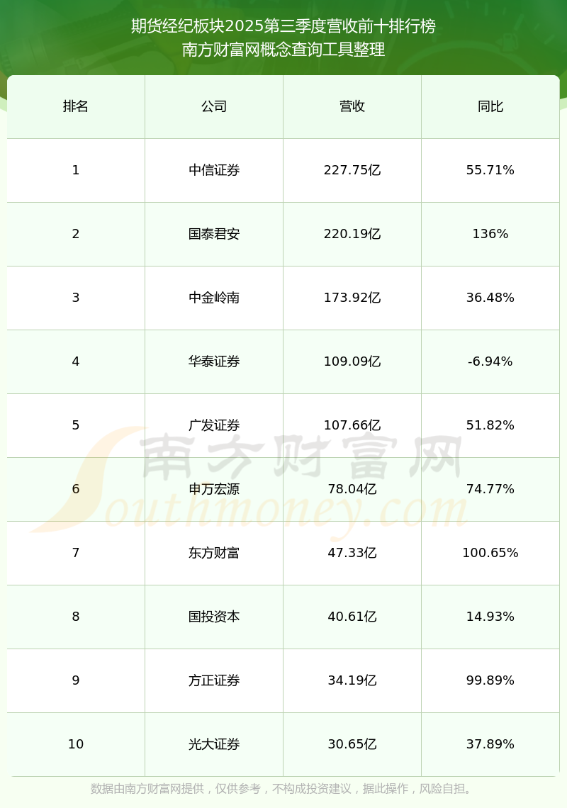 按照南方财富网概念查询工具统计,该股所属板块为期货经纪板块,该板块共有25只股票,华创云信2025第三季度营收在该板块中排名为第25名,该板块2025第三季度营收排名前十的股票如下表: