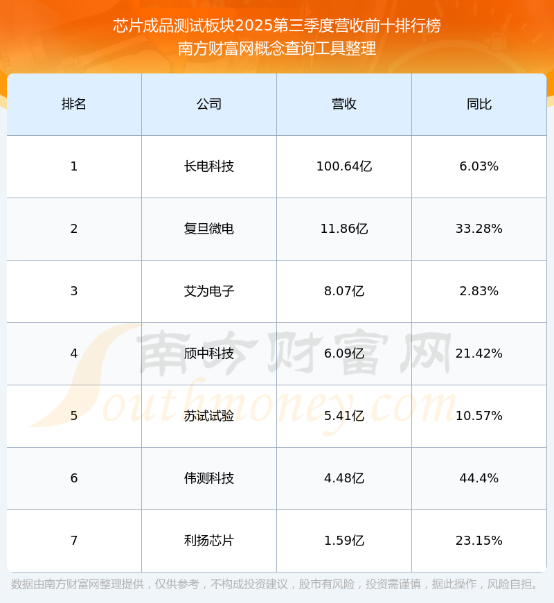 按照南方财富网概念查询工具统计,该股所属板块为芯片成品测试板块,该板块共有7只股票,伟测科技2025第三季度营收在该板块中排名为第6名,该板块2025第三季度营收排名前十的股票如下表: