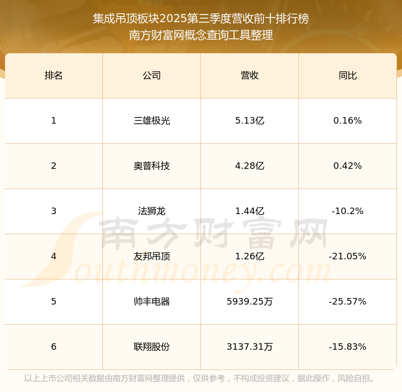 按照南方财富网概念查询工具统计,该股所属板块为集成吊顶板块,该板块共有6只股票,奥普科技2025第三季度营收在该板块中排名为第2名,该板块2025第三季度营收排名前十的股票如下表: