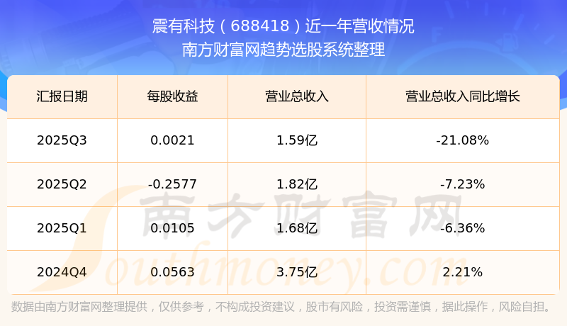 财报显示,2025年第三季度震有科技营收1.59亿元,同比增长-21.08%,净利润40.9万元,同比增长-95.39%。