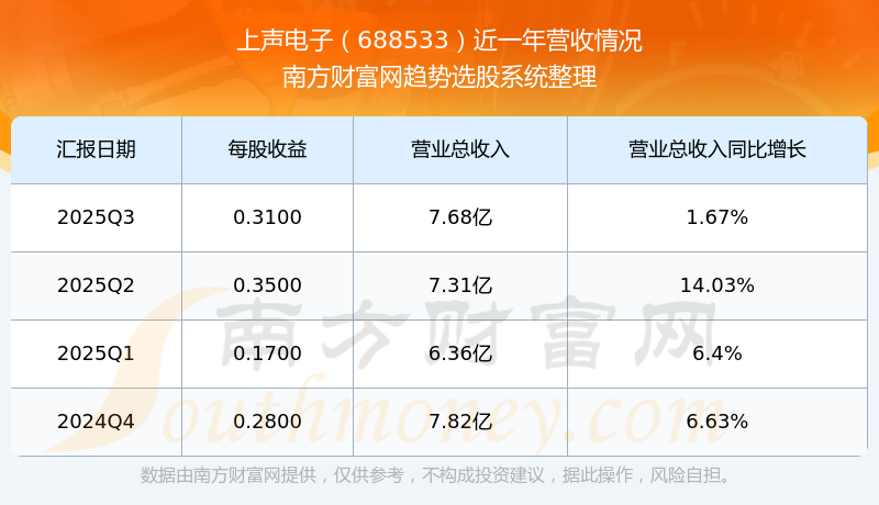 上声电子(688533)披露2025年第三季度报告,报告期实现营收7.68亿元,同比1.67%;归母净利润5012.5万元,同比-35.79%;扣非净利润4754.2万元,同比-19.17%。