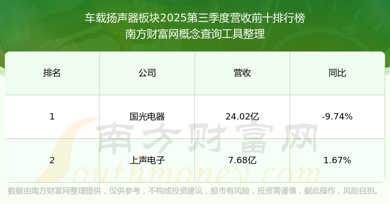 按照南方财富网概念查询工具统计,该股所属板块为车载扬声器板块,该板块共有2只股票,上声电子2025第三季度营收在该板块中排名为第2名,该板块2025第三季度营收排名前十的股票如下表: