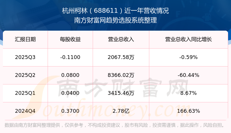 杭州柯林(688611)发布2025年第三季度财报。2025年第三季度杭州柯林实现营业收入2067.58万元,同比增加-0.59元%,环比增加-75.29%;净利润为-1725.31万元,同比增长-4784.89%,环比增长-231.13%。