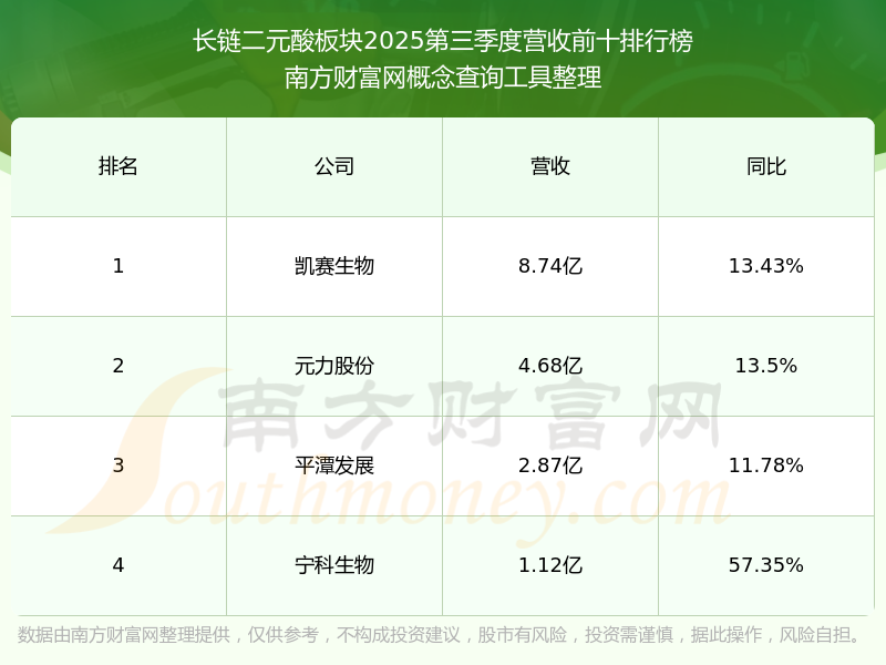 按照南方财富网概念查询工具统计,该股所属板块为长链二元酸板块,该板块共有4只股票,凯赛生物2025第三季度营收在该板块中排名为第1名,该板块2025第三季度营收排名前十的股票如下表: