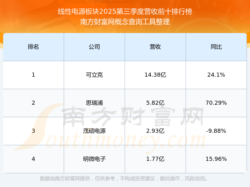 按照南方财富网概念查询工具统计,该股所属板块为线性电源板块,该板块共有4只股票,明微电子2025第三季度营收在该板块中排名为第4名,该板块2025第三季度营收排名前十的股票如下表: