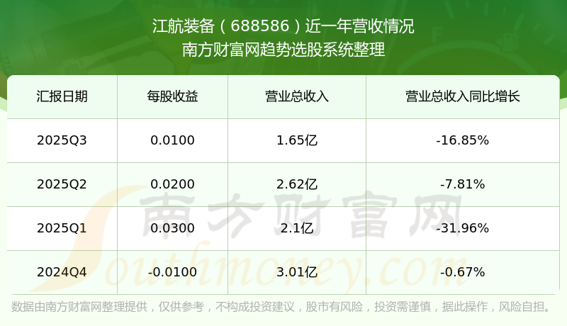 于2025年第三季度,江航装备披露了其业绩表现,其中主营业务收入1.65亿元,相较于去年同期-16.85%。此外,公司归属于母公司的净利润为579.22万元,同比增长了-82.16%。在扣除所有非经常性损益后,净利润104.89万元,同比增长-94.12%。