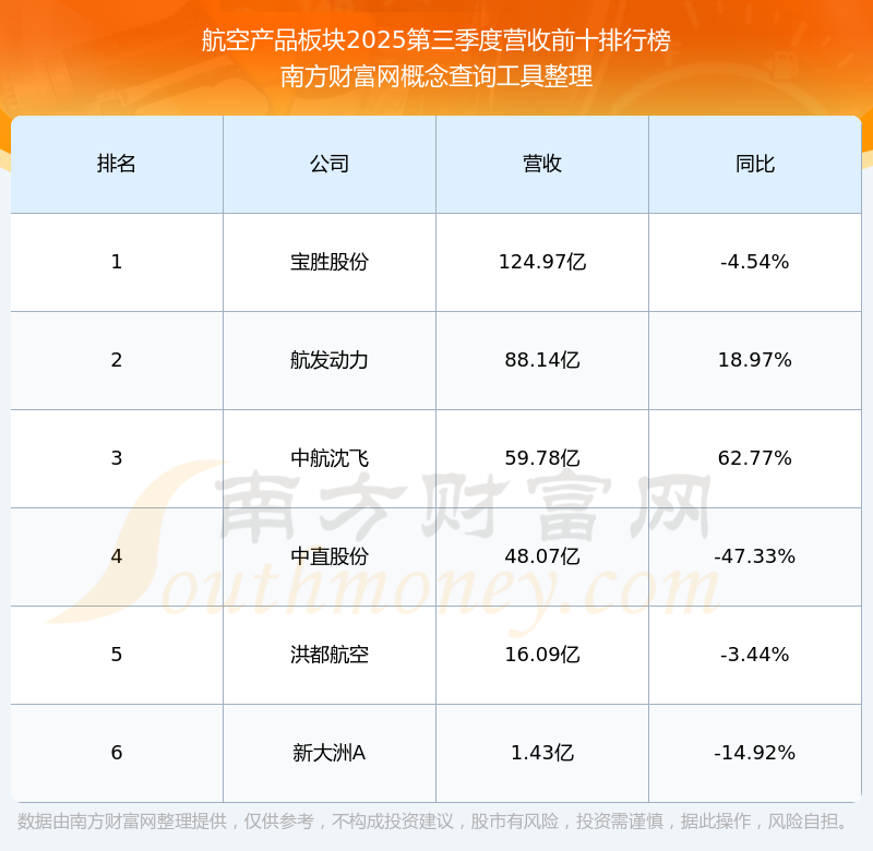 按照南方财富网概念查询工具统计,该股所属板块为航空产品板块,该板块共有6只股票,江航装备2025第三季度营收在该板块中排名为第6名,该板块2025第三季度营收排名前十的股票如下表: