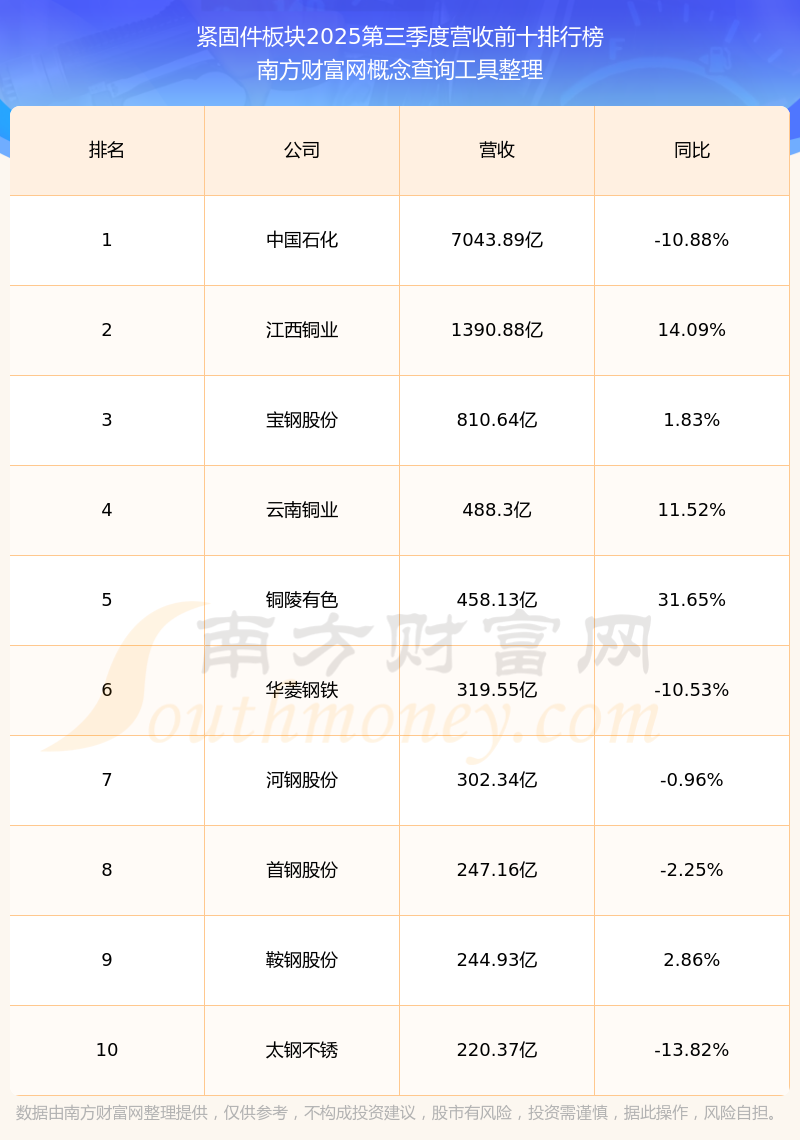 按照南方财富网概念查询工具统计,该股所属板块为紧固件板块,该板块共有33只股票,晋亿实业2025第三季度营收在该板块中排名为第28名,该板块2025第三季度营收排名前十的股票如下表: