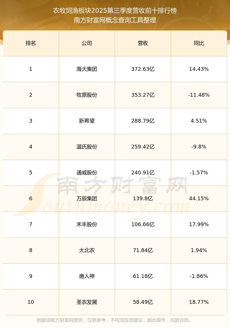 按照南方财富网概念查询工具统计,该股所属板块为农牧饲渔板块,该板块共有78只股票,禾丰股份2025第三季度营收在该板块中排名为第7名,该板块2025第三季度营收排名前十的股票如下表: