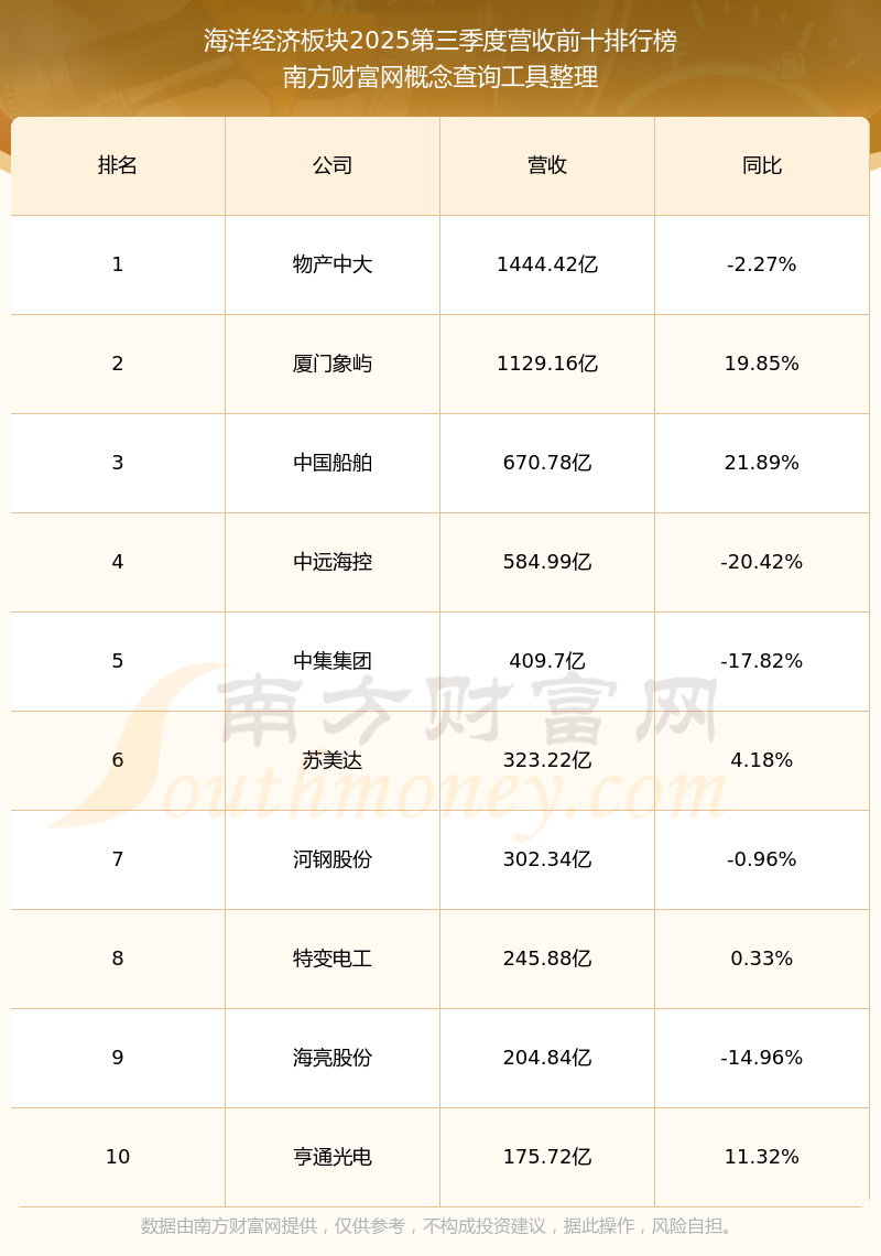 按照南方财富网概念查询工具统计,该股所属板块为海洋经济板块,该板块共有145只股票,中远海特2025第三季度营收在该板块中排名为第23名,该板块2025第三季度营收排名前十的股票如下表: