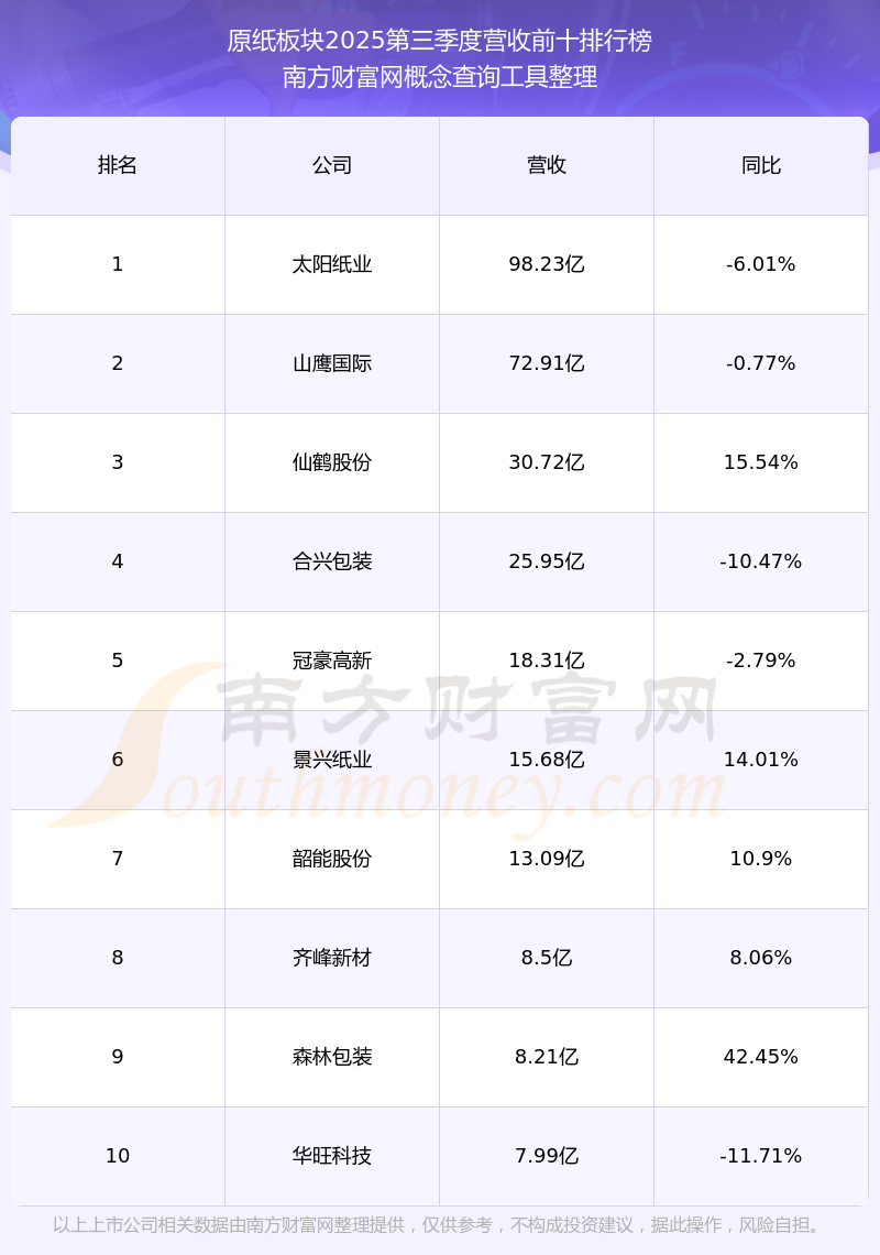 按照南方财富网概念查询工具统计,该股所属板块为原纸板块,该板块共有18只股票,荣晟环保2025第三季度营收在该板块中排名为第14名,该板块2025第三季度营收排名前十的股票如下表:
