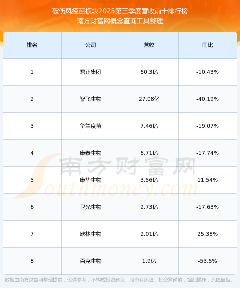 按照南方财富网概念查询工具统计,该股所属板块为破伤风疫苗板块,该板块共有8只股票,欧林生物2025第三季度营收在该板块中排名为第7名,该板块2025第三季度营收排名前十的股票如下表: