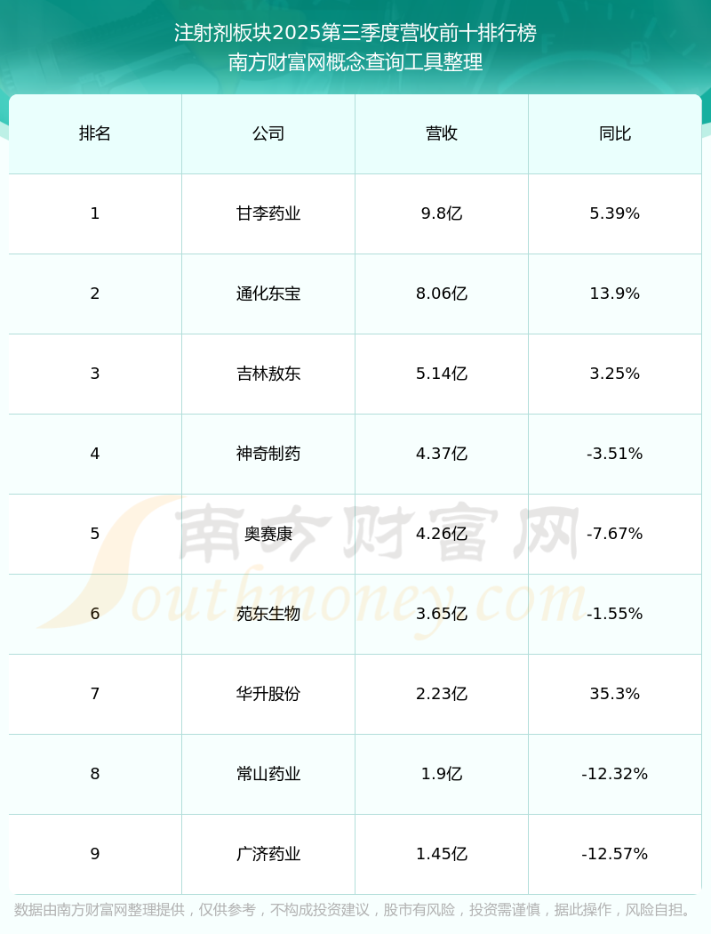 按照南方财富网概念查询工具统计,该股所属板块为注射剂板块,该板块共有9只股票,华润双鹤2025第三季度营收在该板块中排名为第9名,该板块2025第三季度营收排名前十的股票如下表: