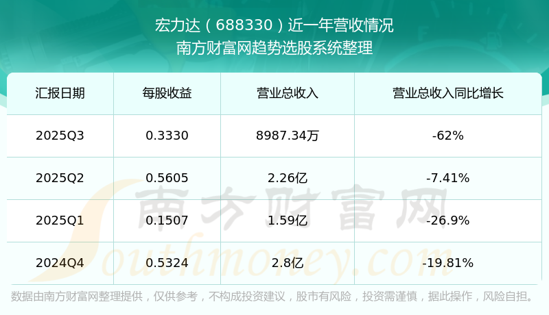 宏力达2025年第三季度财报显示,公司主营收入8987.34万元,同比-62%;归母净利润4618.19万元,同比-12.25%;扣非净利润2538.76万元,同比-35.35%。