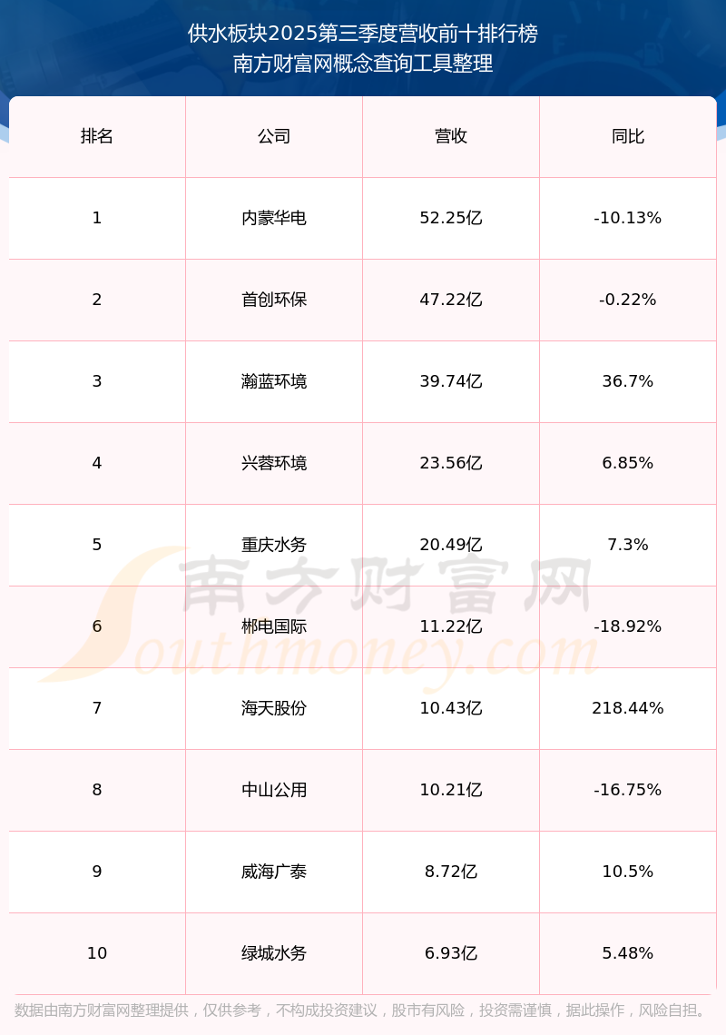 按照南方财富网概念查询工具统计,该股所属板块为供水板块,该板块共有20只股票,重庆水务2025第三季度营收在该板块中排名为第5名,该板块2025第三季度营收排名前十的股票如下表: