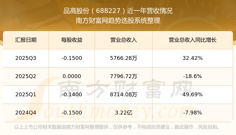 品高股份2025年第三季度财报显示,公司主营收入5766.28万元,同比32.42%;归母净利润-1703.03万元,同比21.19%;扣非净利润-1954.45万元,同比20.19%;