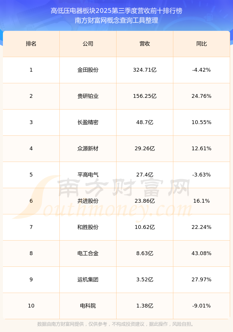按照南方财富网概念查询工具统计,该股所属板块为高低压电器板块,该板块共有10只股票,百利电气2025第三季度营收在该板块中排名为第10名,该板块2025第三季度营收排名前十的股票如下表:
