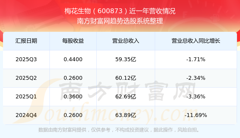 梅花生物股票近一年营收情况如下表: