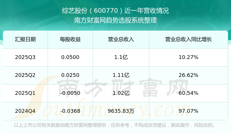 综艺股份(600770)发布2025年第三季度财报。2025年第三季度综艺股份实现营业收入1.1亿元,同比增加10.27元%,环比增加-0.89%;净利润为7090.27万元,同比增长-22.47%,环比增长168.7%。