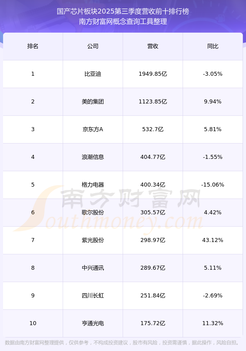 按照南方财富网概念查询工具统计,该股所属板块为国产芯片板块,该板块共有392只股票,综艺股份2025第三季度营收在该板块中排名为第351名,该板块2025第三季度营收排名前十的股票如下表: