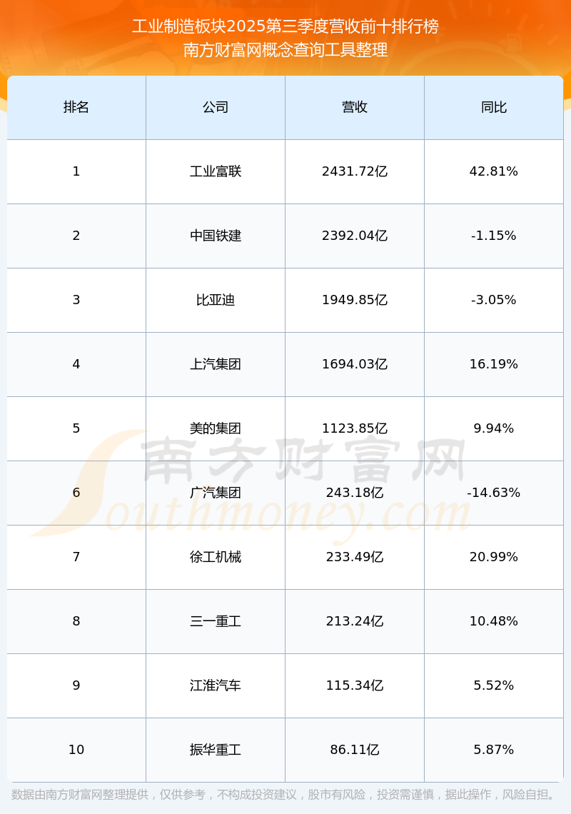 按照南方财富网概念查询工具统计,该股所属板块为工业制造板块,该板块共有23只股票,中国能建2025第三季度营收在该板块中排名为第23名,该板块2025第三季度营收排名前十的股票如下表: