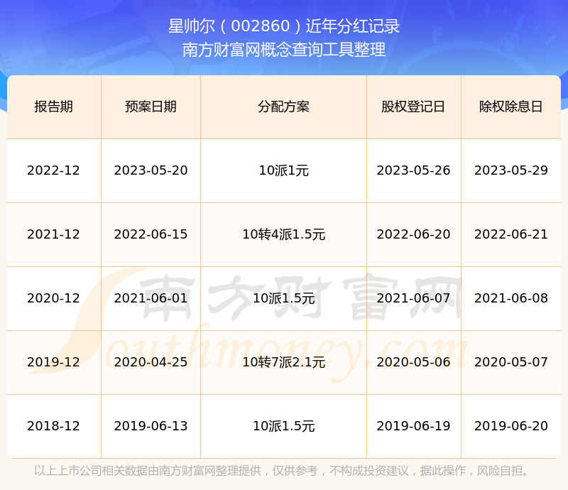 星帅尔最新一次公布的分红方案为10派1元。本次权益分派股权登记日为2023年5月26日,除权除息日为2023年5月29日,派息日为2023年5月29日。
