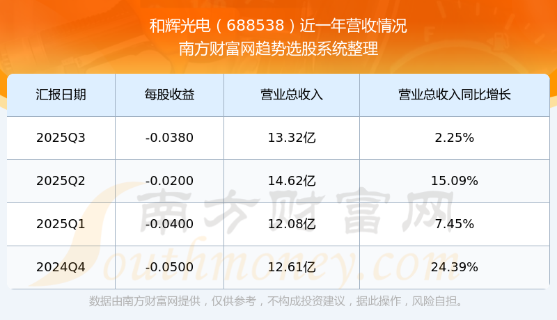 和辉光电(688538)披露2025年第三季度报告,报告期实现营收13.32亿元,同比2.25%;归母净利润-5.3亿元,同比-9.55%;扣非净利润-5.4亿元,同比-5.51%;基本每股收益-0.04元。