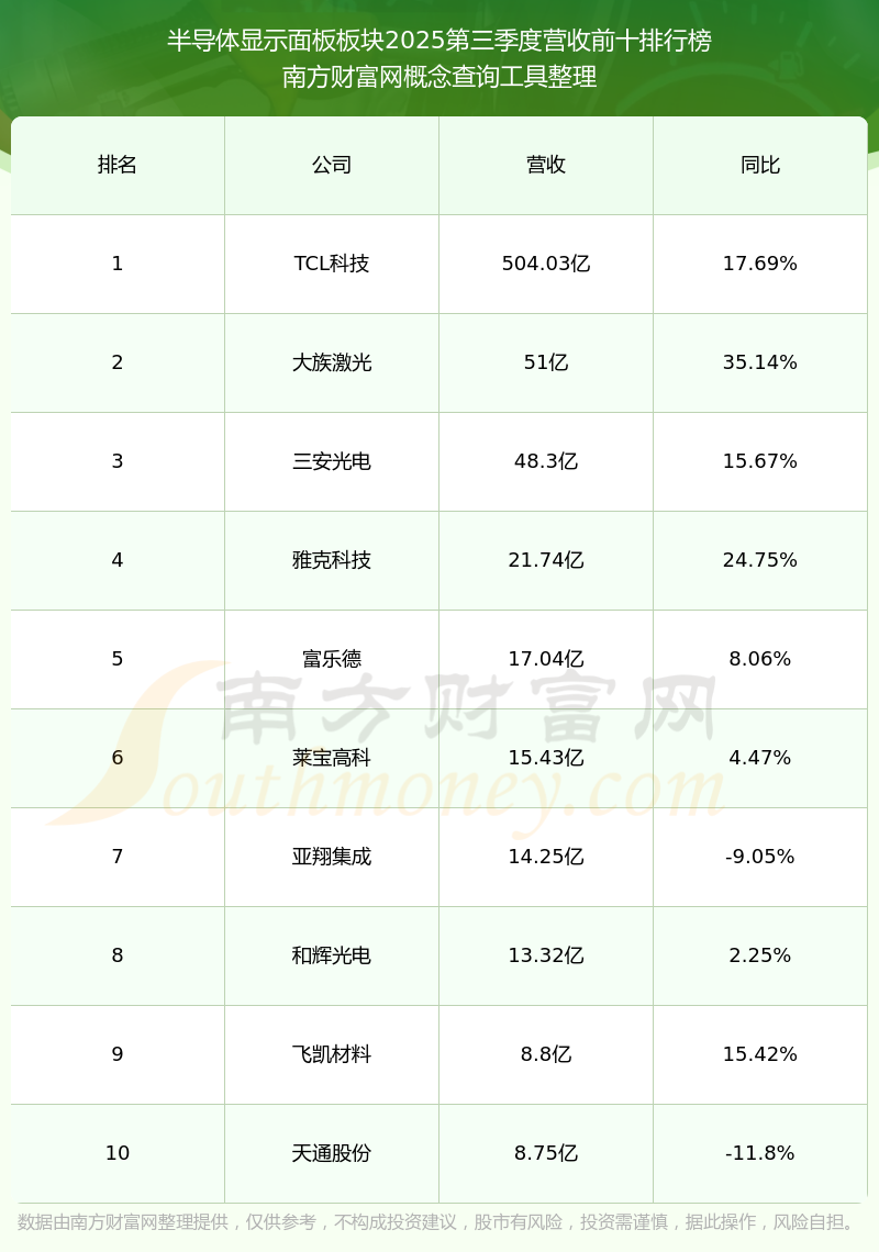 按照南方财富网概念查询工具统计,该股所属板块为半导体显示面板板块,该板块共有21只股票,和辉光电2025第三季度营收在该板块中排名为第8名,该板块2025第三季度营收排名前十的股票如下表: